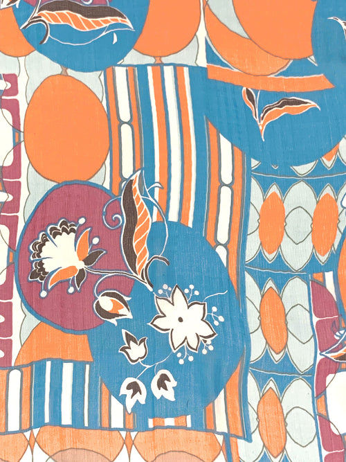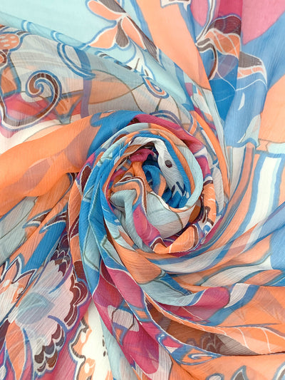 Atomic Tangerine/Cyan Cornflower Blue/Multi 100% Silk Geometric Floral Print Crinkle Chiffon 54W