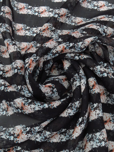 Black/Dark Rose Pink/Sky Blue/Multi 100% Silk Horizontal Floral Stripe Print Chiffon 43W