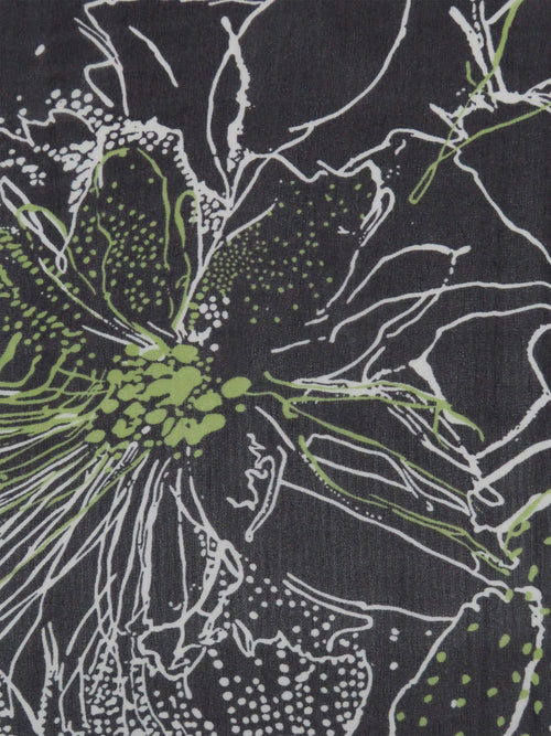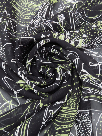 Black/White/Spring Bud Green 100% Silk Floral Outline Print Chiffon 44W