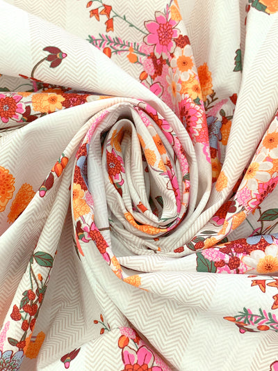 Tangerine/Hot Pink/Regal Red/Multi 100% Cotton Floral Over Vertical Chevron Stripe Print Lawn - NY Designer - 56W