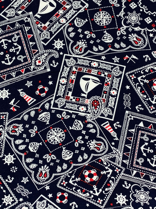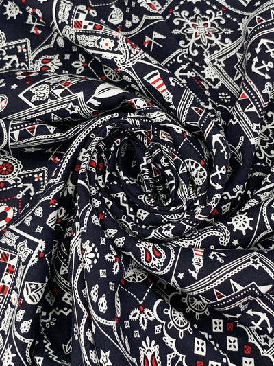 Dark Navy/White/Red 100% Rayon Stylized Nautical Print Challis 43W