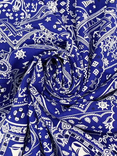 Royal Azure Blue/White/Black 100% Rayon Stylized Nautical Print Challis 43W