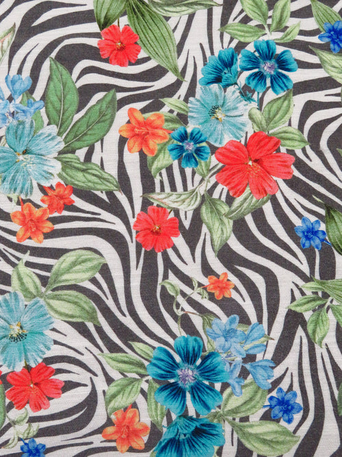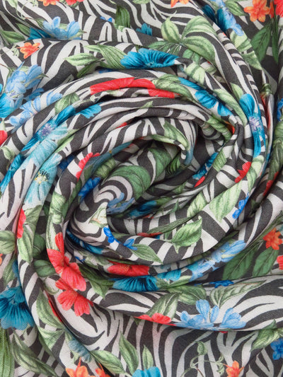 Dark Gray/Fern Green/Coral Red/Multi Rayon/Linen Tropical Floral On Zebra Stripe Print Twill Shirting - NY Designer - 55W