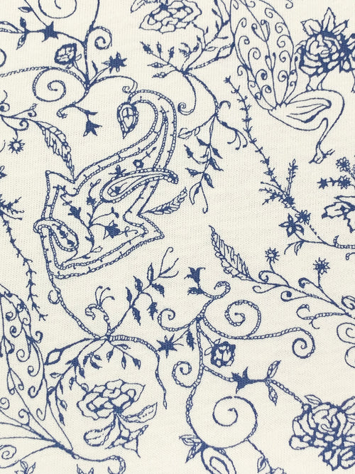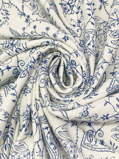 Eggshell/Blueberry 100% Cotton Floral Paisley Vines Print Jersey Knit 66W
