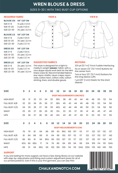 Chalk and Notch Patterns - Wren Blouse & Dress - Sizes 0-30