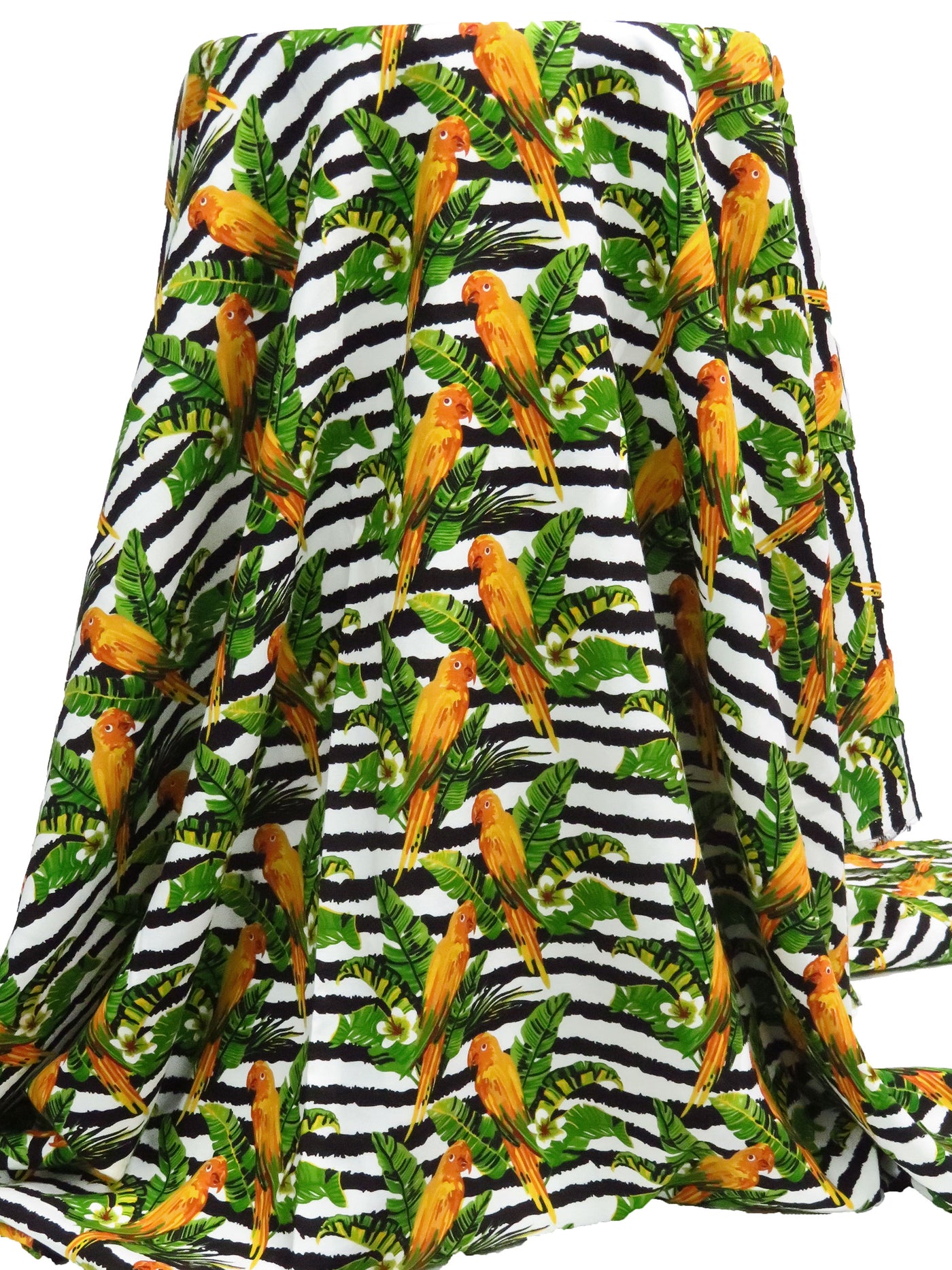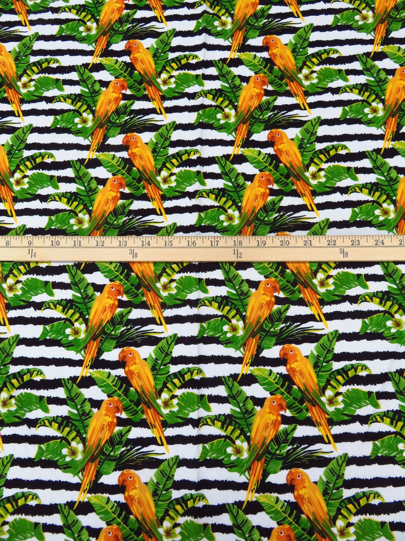 Marigold/Royal Green/Black/White 100% Rayon Tropical Bird Floral Over Horizontal Rugged Stripe Print Challis 54W
