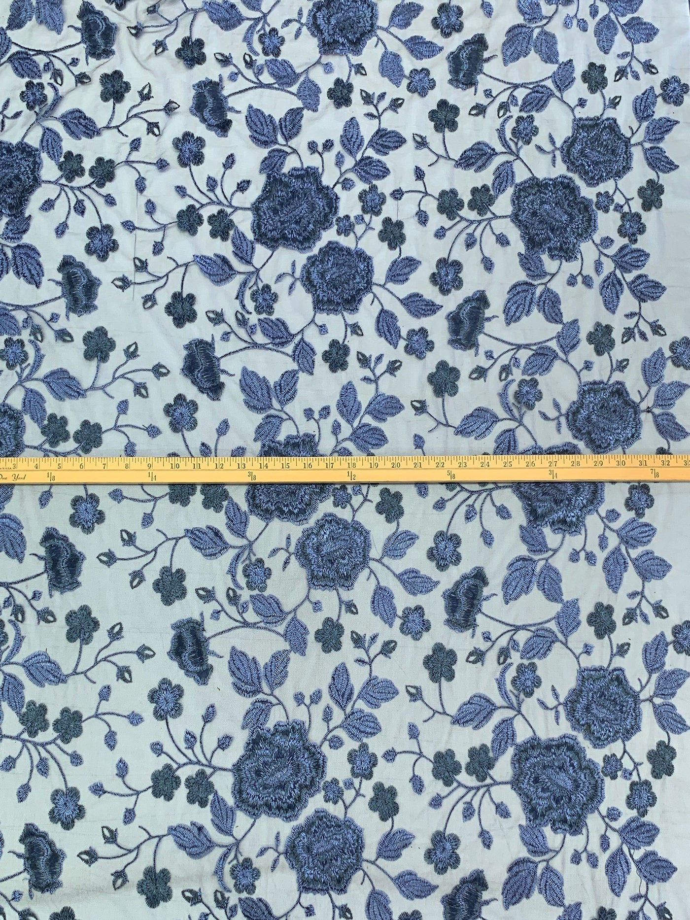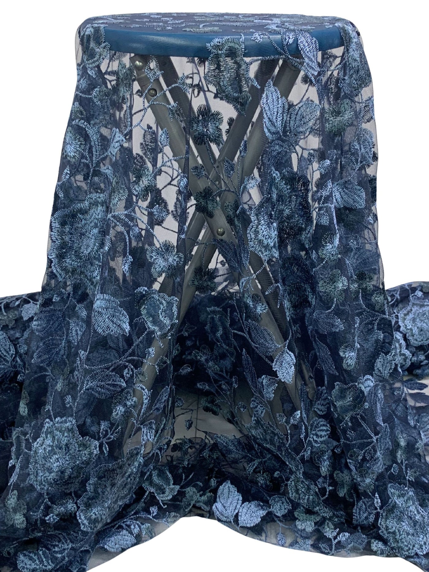French Sky Blue/Navy/Slate 100% Nylon Embroidered Floral Netting - NY Designer - 58W