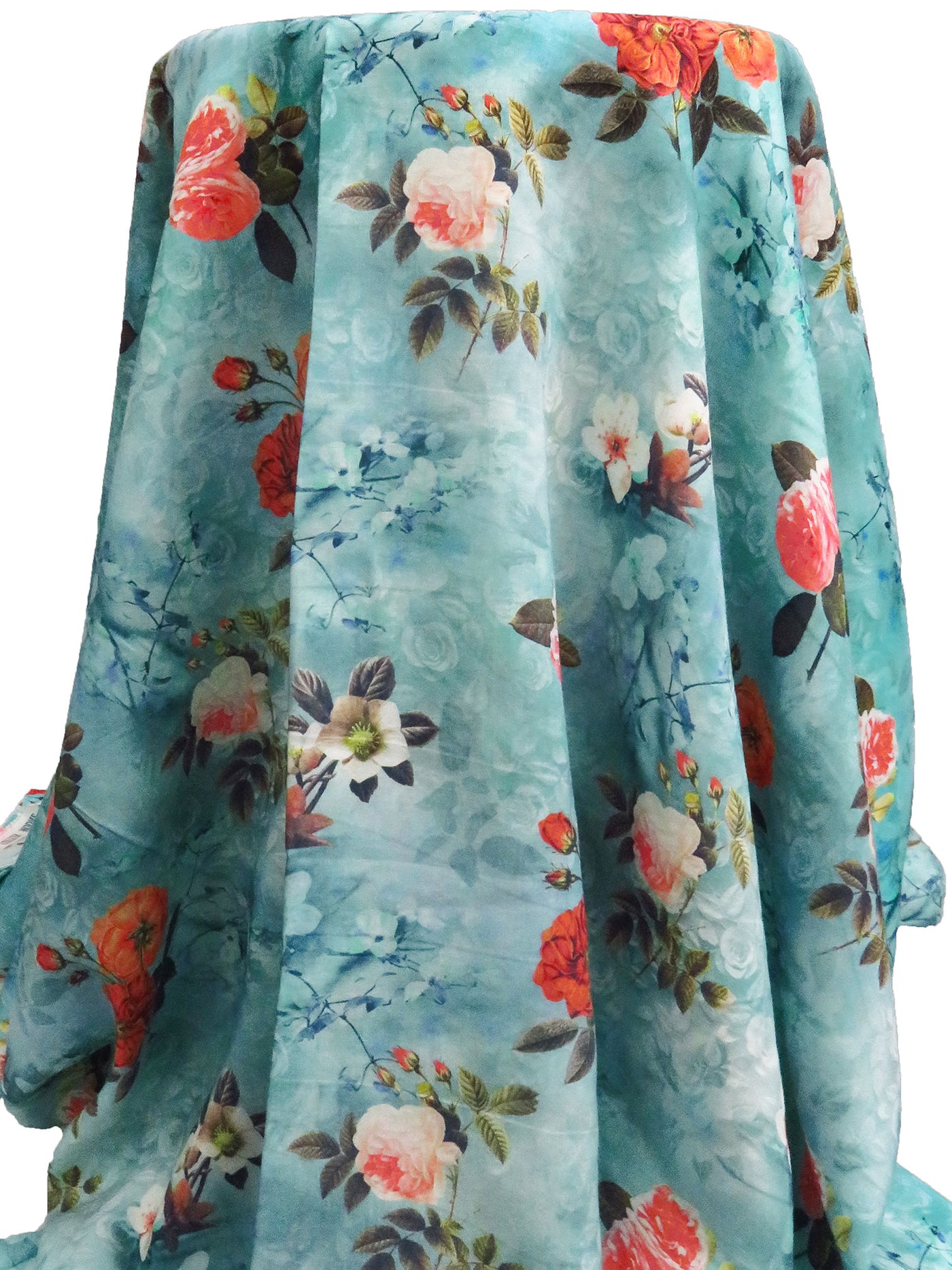 Seafoam Blue/Orange Soda/Olive/Multi 100% Cotton Floral Print Lawn 58W