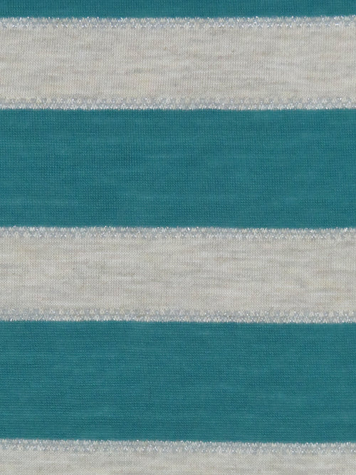 Heathered Oatmeal/Teal Green/Silver Rayon/Metallic/Lycra Horizontal Stripe Jersey Knit 56W
