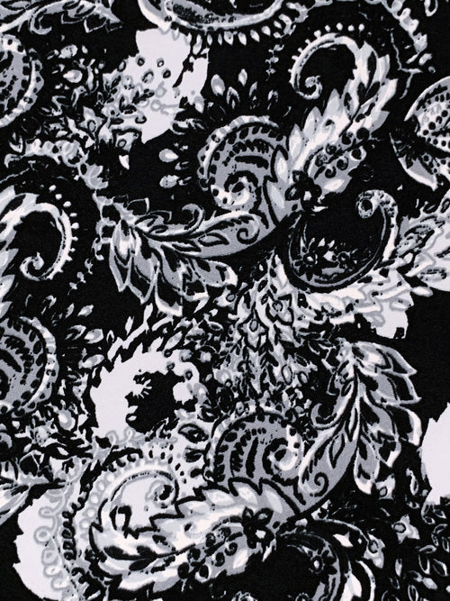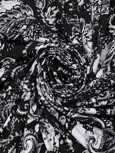 Bright Silver/Black/Aluminum Polyester/Lycra Stylized Floral Scrolls Print DTY Knit 59W
