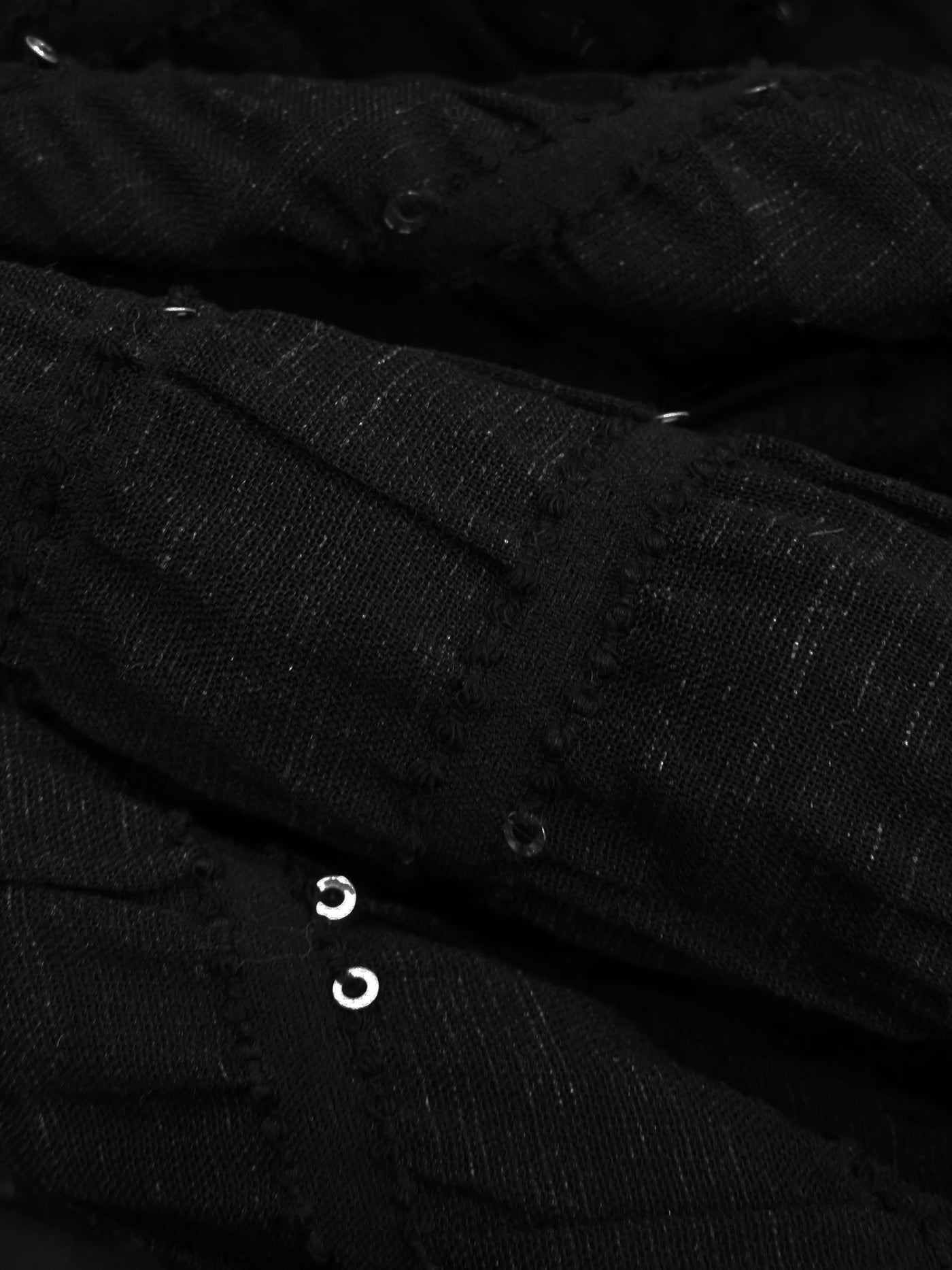 • Additional: Chiffon. Soft Hand. Elastic Woven Into Chiffon To Give Gathered or "Shirred" Effect. Natural Stretch Due To "Shirred" Effect. Silver Sequins Woven In. Fluid Drape With Airy Movement. Sheer.