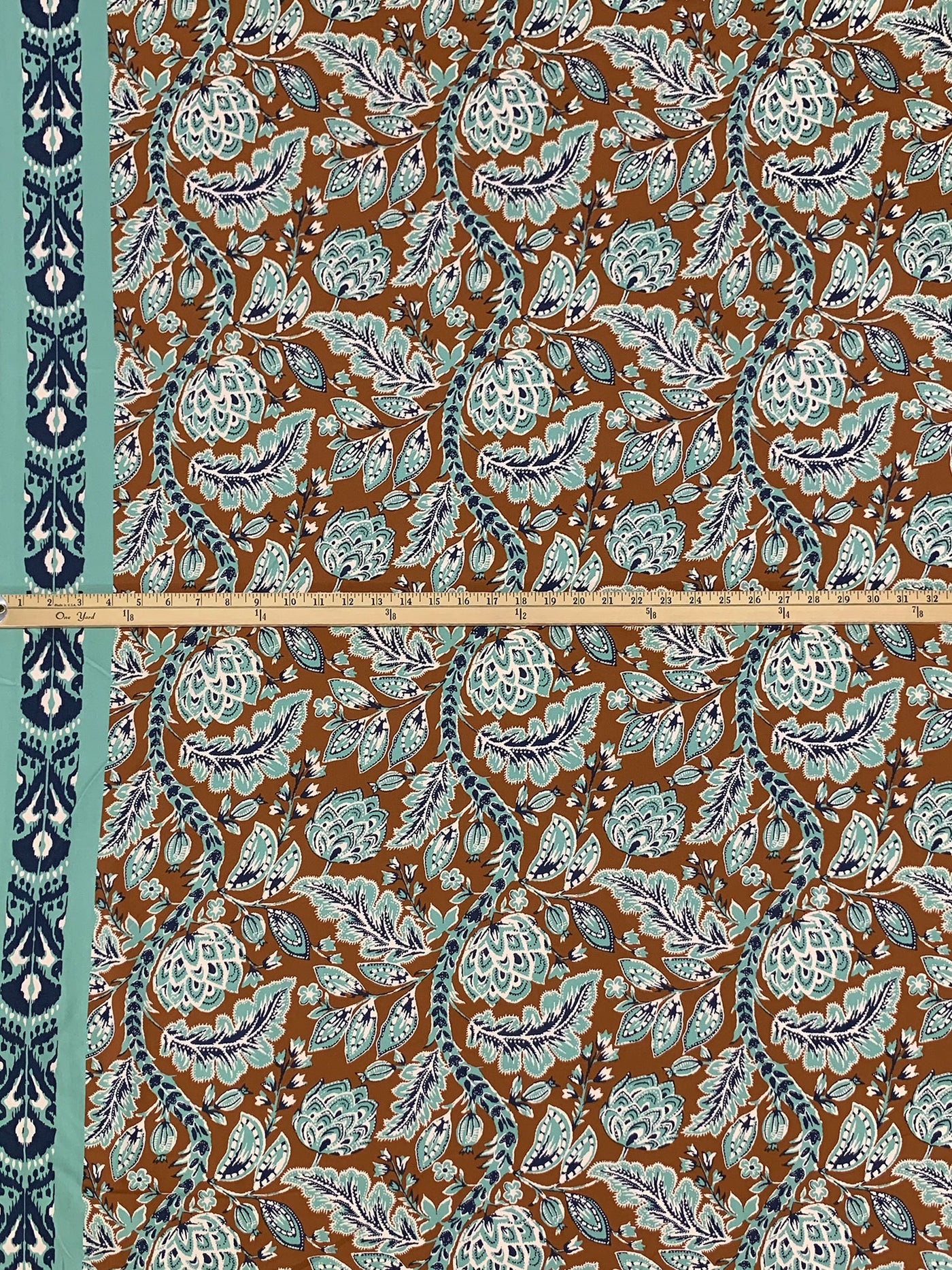 Dark Bronze/Spearmint/Navy Blue/Off-White Rayon/Nylon/Lycra Double Border Stylized Floral Print Stretch Twill Bottom Weight Woven - NY Designer - 54W