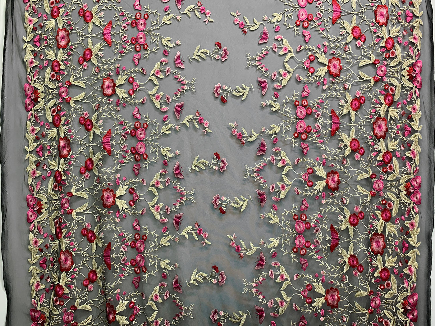 Amaranth Pink/Vivid Auburn/Muted Cream/Multi 100% Nylon Double Border Embroidered Floral Design On Netting - NY Designer - 54W