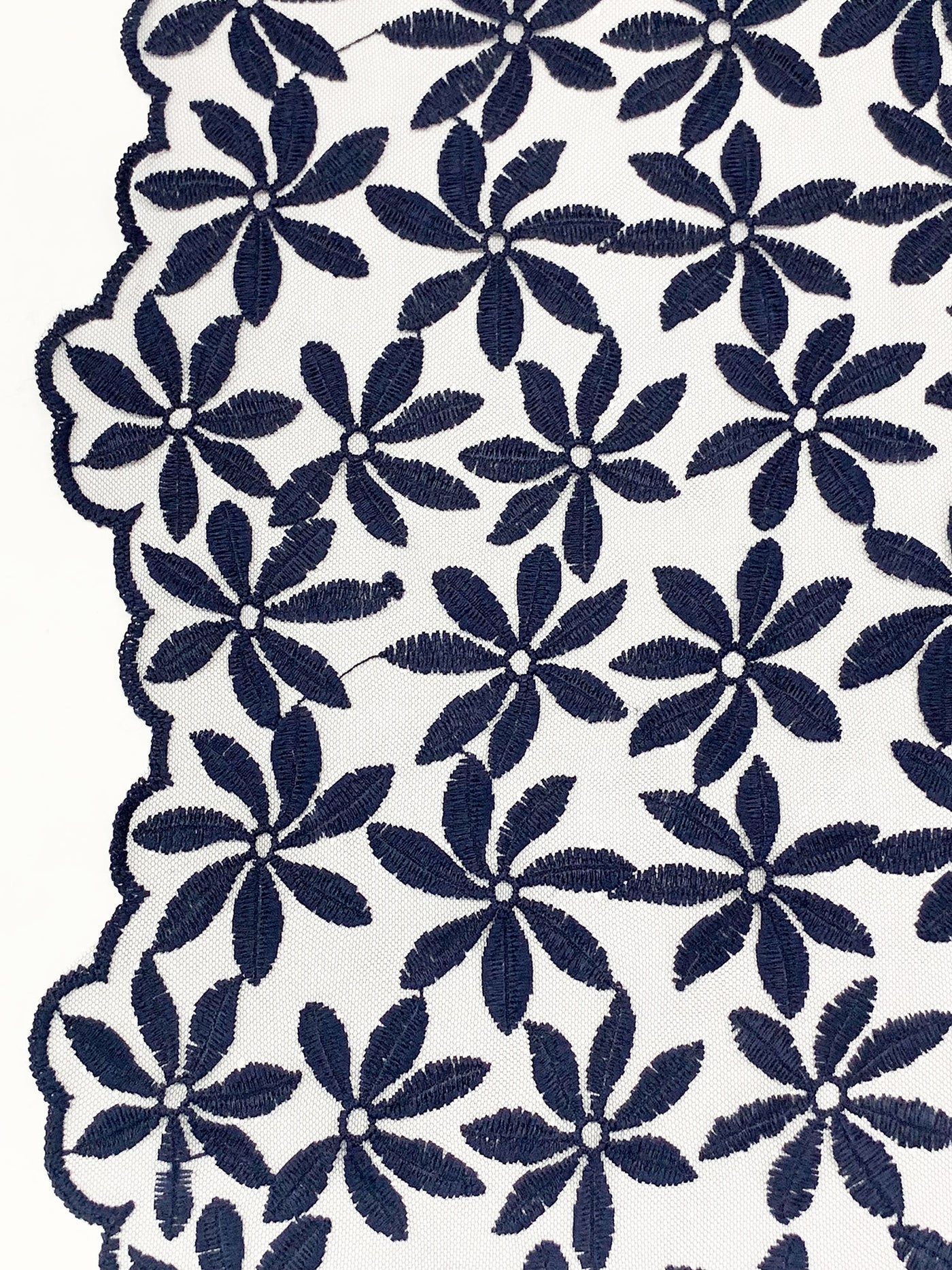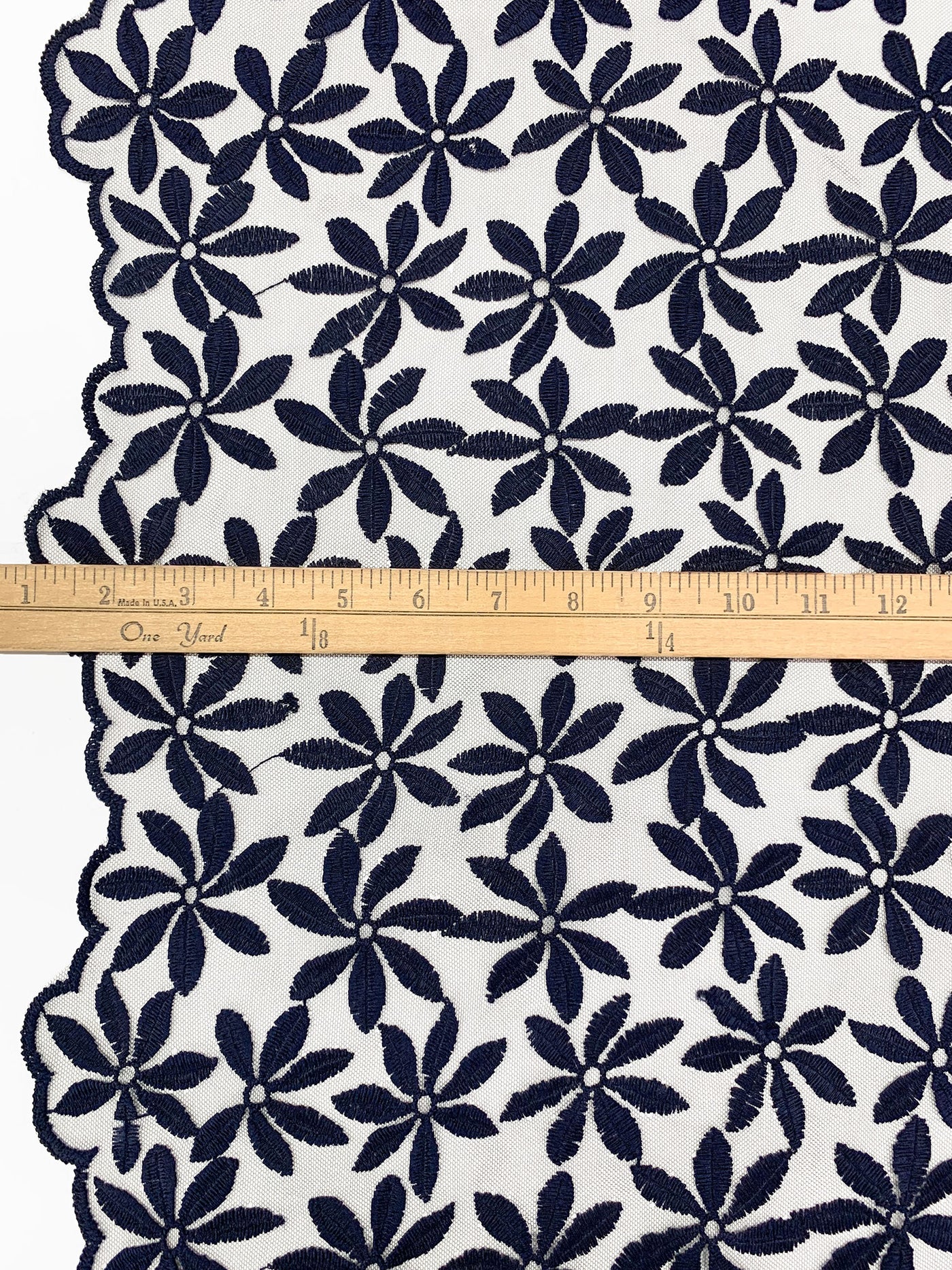 Navy 100% Nylon Double Border Embroidered Floral Design On Netting - NY Designer - 58W