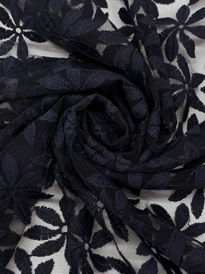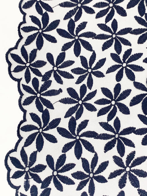 Navy 100% Nylon Double Border Embroidered Floral Design On Netting - NY Designer - 58W