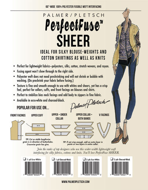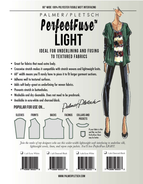 We carry a wide range of interfacing for your sewing needs. We carry Palmer/Pletsch pre-packaged interfacing, select Pellon products and garment-industry quality interfacing direct from NYC design rooms.