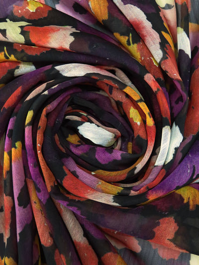 Sunset Orange/Plum/Fuchsia/Black 100% Polyester Watercolor Floral Print Crinkle Chiffon - Imported From Italy - 60W