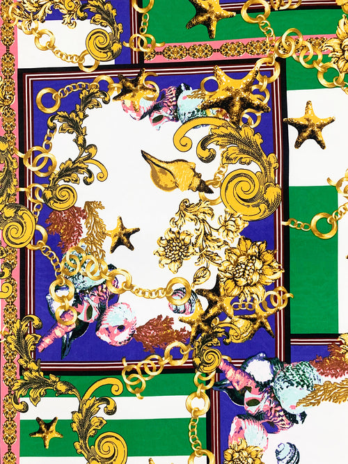 Green/Blue/Gold/White Polyester/Lycra Novelty Nautical Framework Print FTY Knit 56W