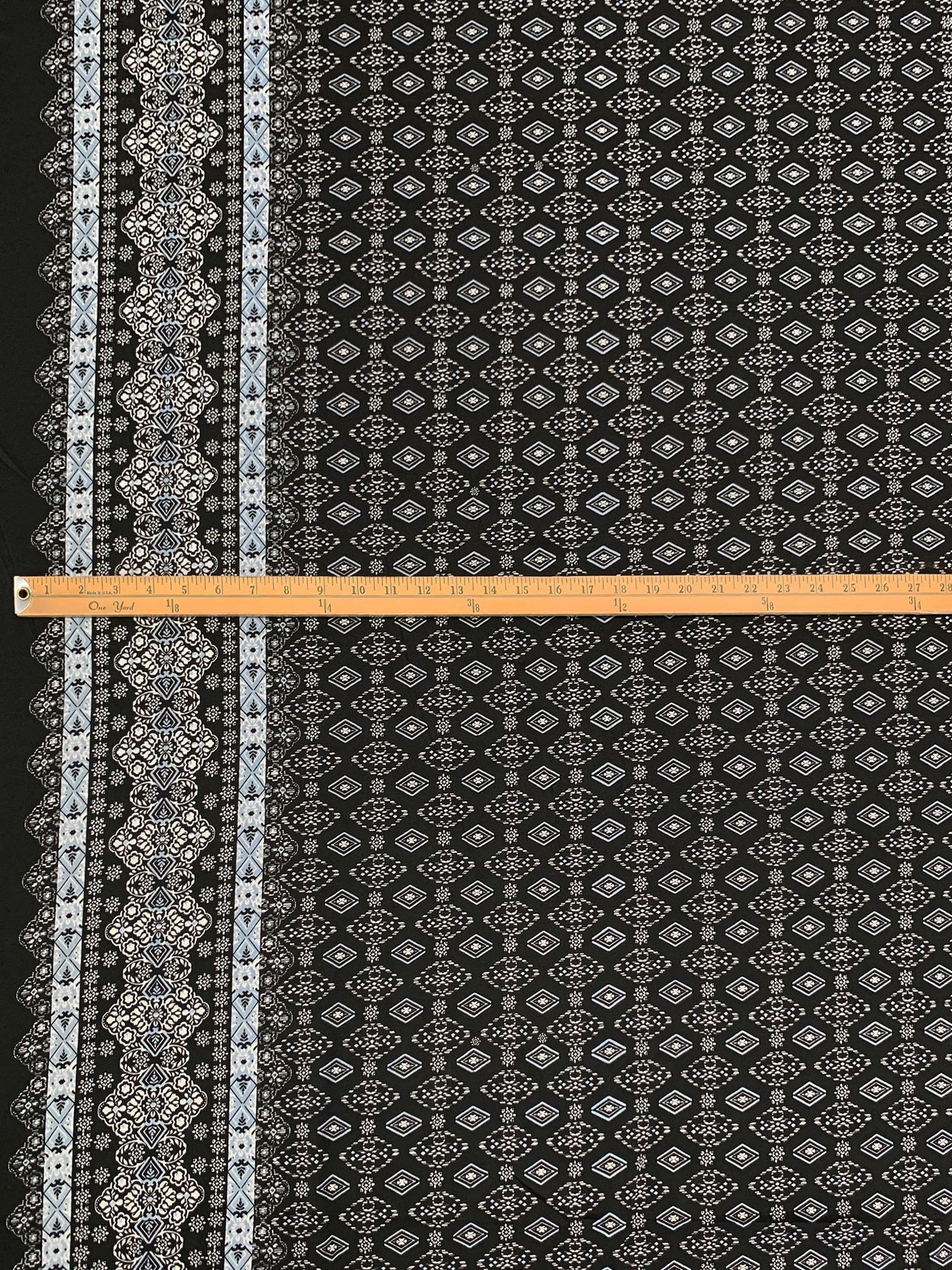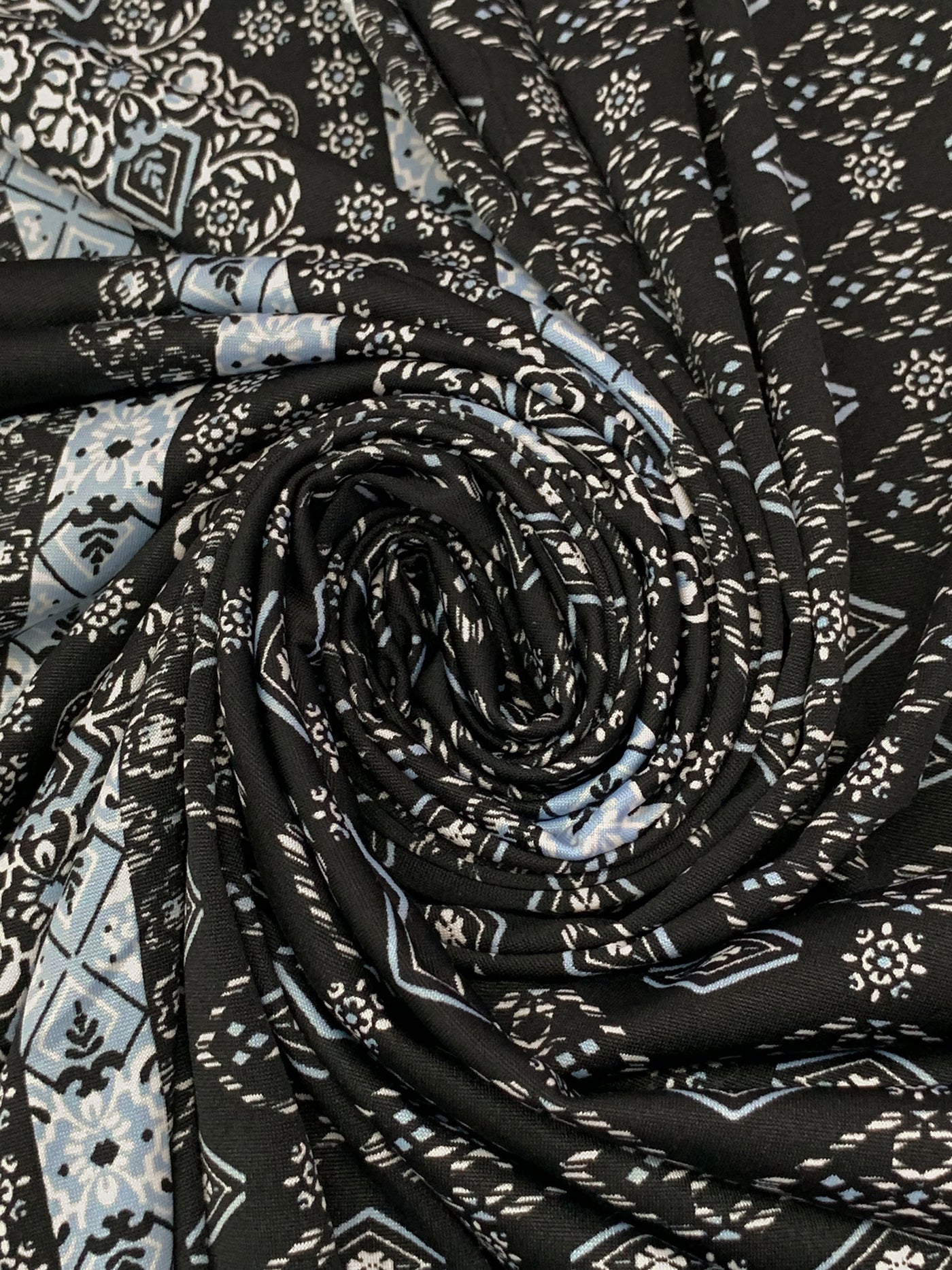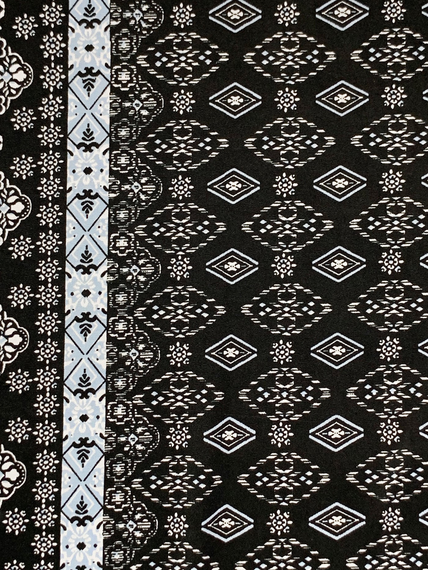 Black/Vista Blue/White Polyester/Lycra Double Border Stylized Medallion Print ITY Knit 60W