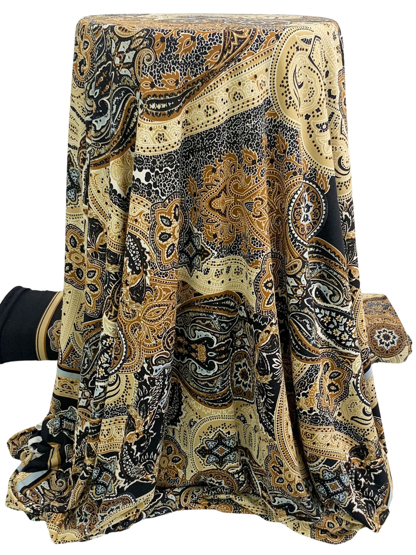 Bronze/Tan/Black/Pewter Blue Polyester/Lycra Double Border Stylized Scrolls Print ITY Knit 60W