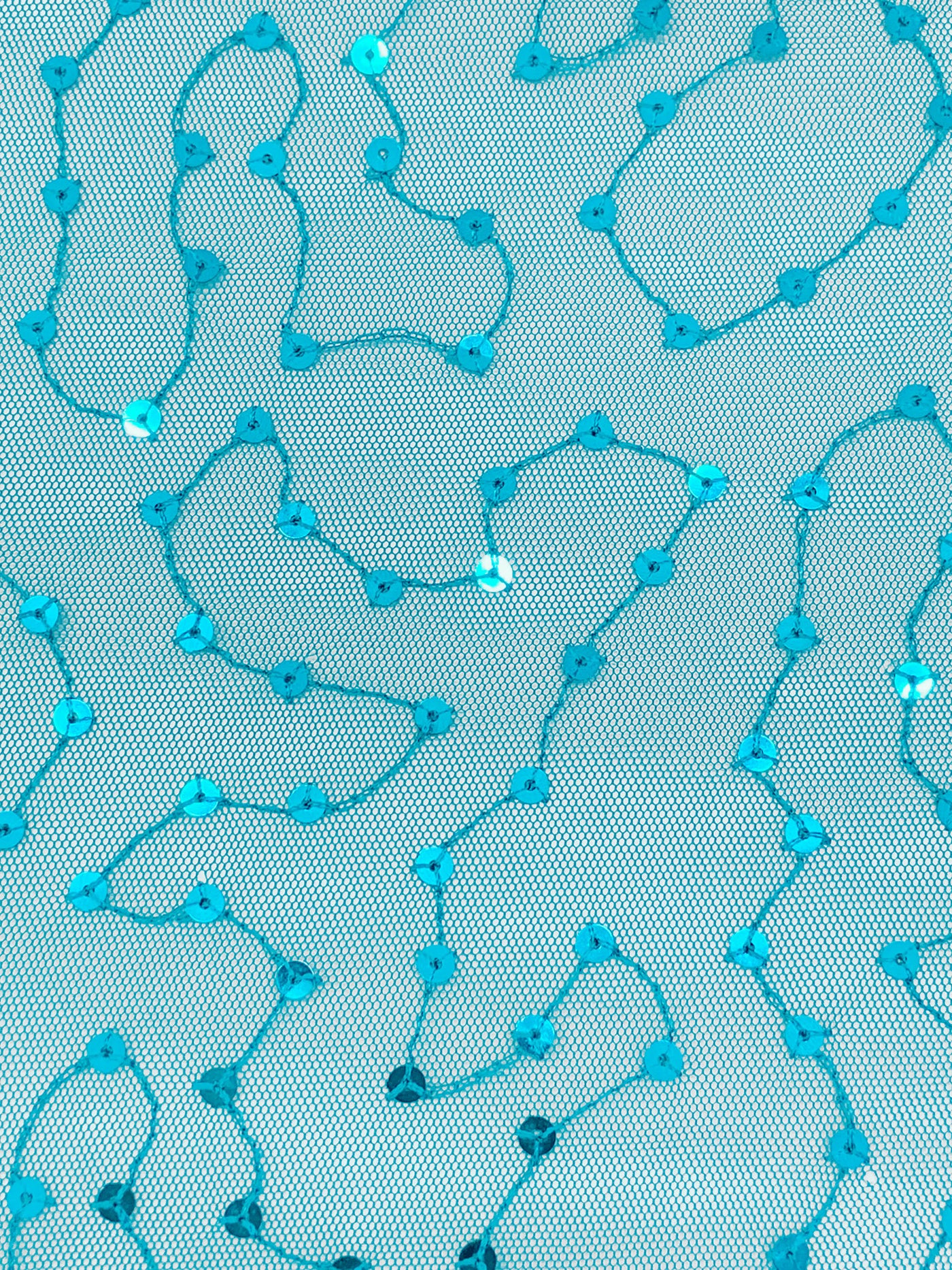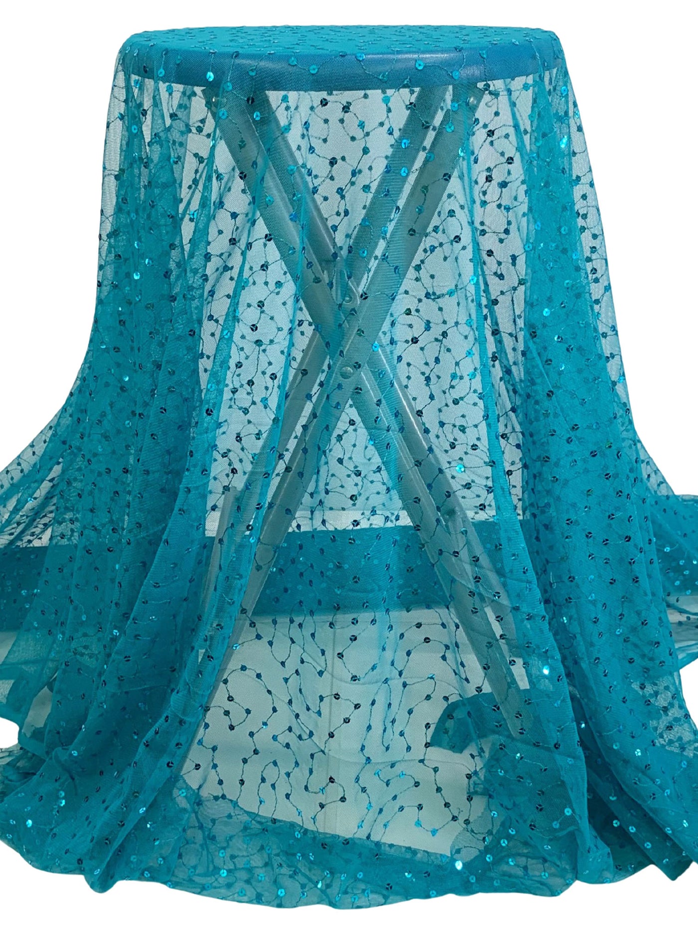 Caribbean Blue 100% Nylon Embroidered Meandering Sequins On Netting - Famous Dress Designer - 56W