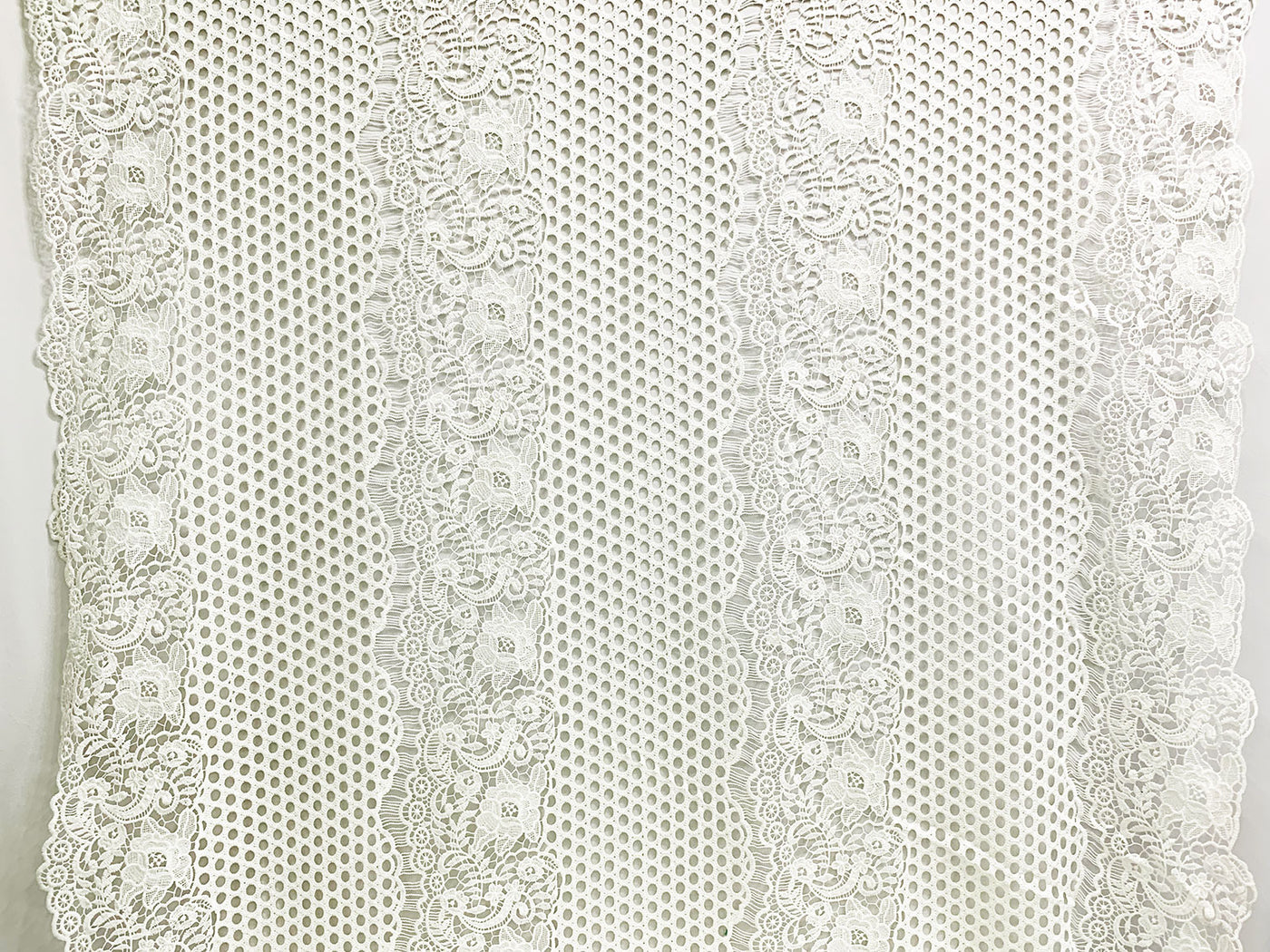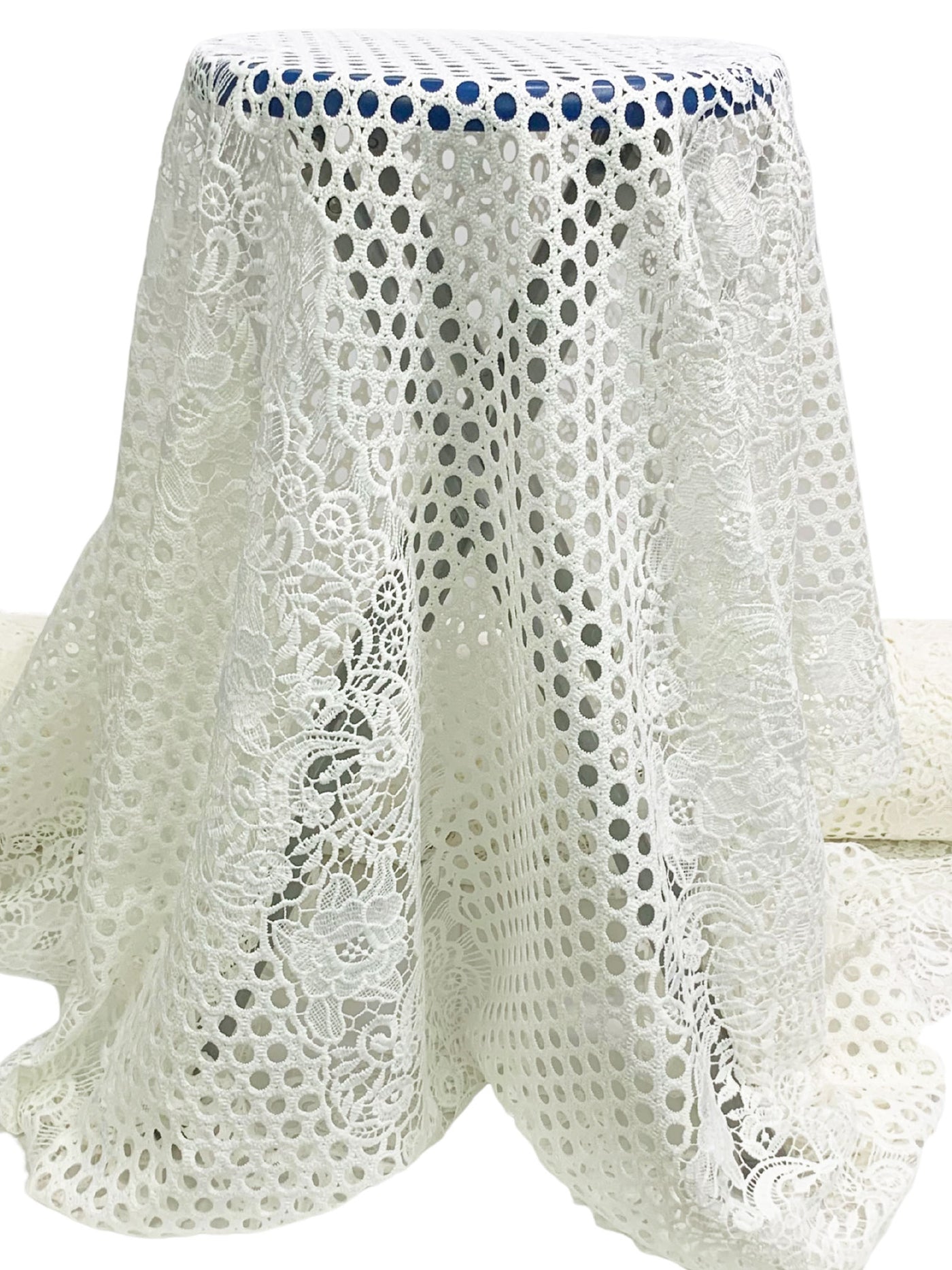 - Additional: Guipure Lace. Soft, Textured Hand. Soft Drape. Sheer. Double Scalloped Border