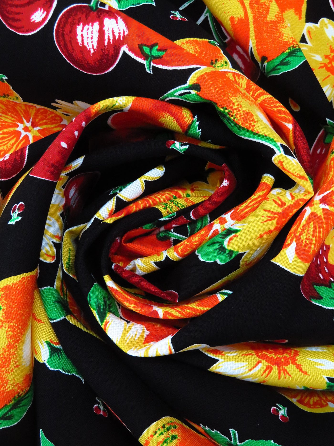 Black/Sunset Yellow/Orange/Multi 100% Rayon Fruit Stripe Print Challis - NY Designer - 43W