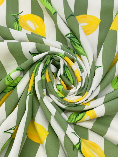 Bright Yellow/Moss Green/White/Multi 100% Rayon Lemons Over Vertical Stripe Print Challis - NY Designer - 54W