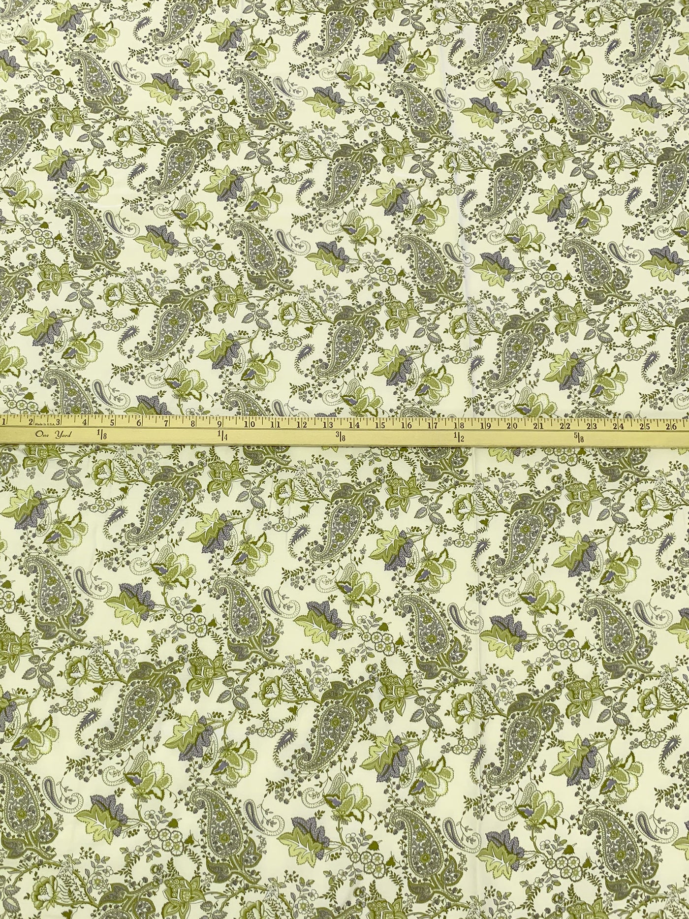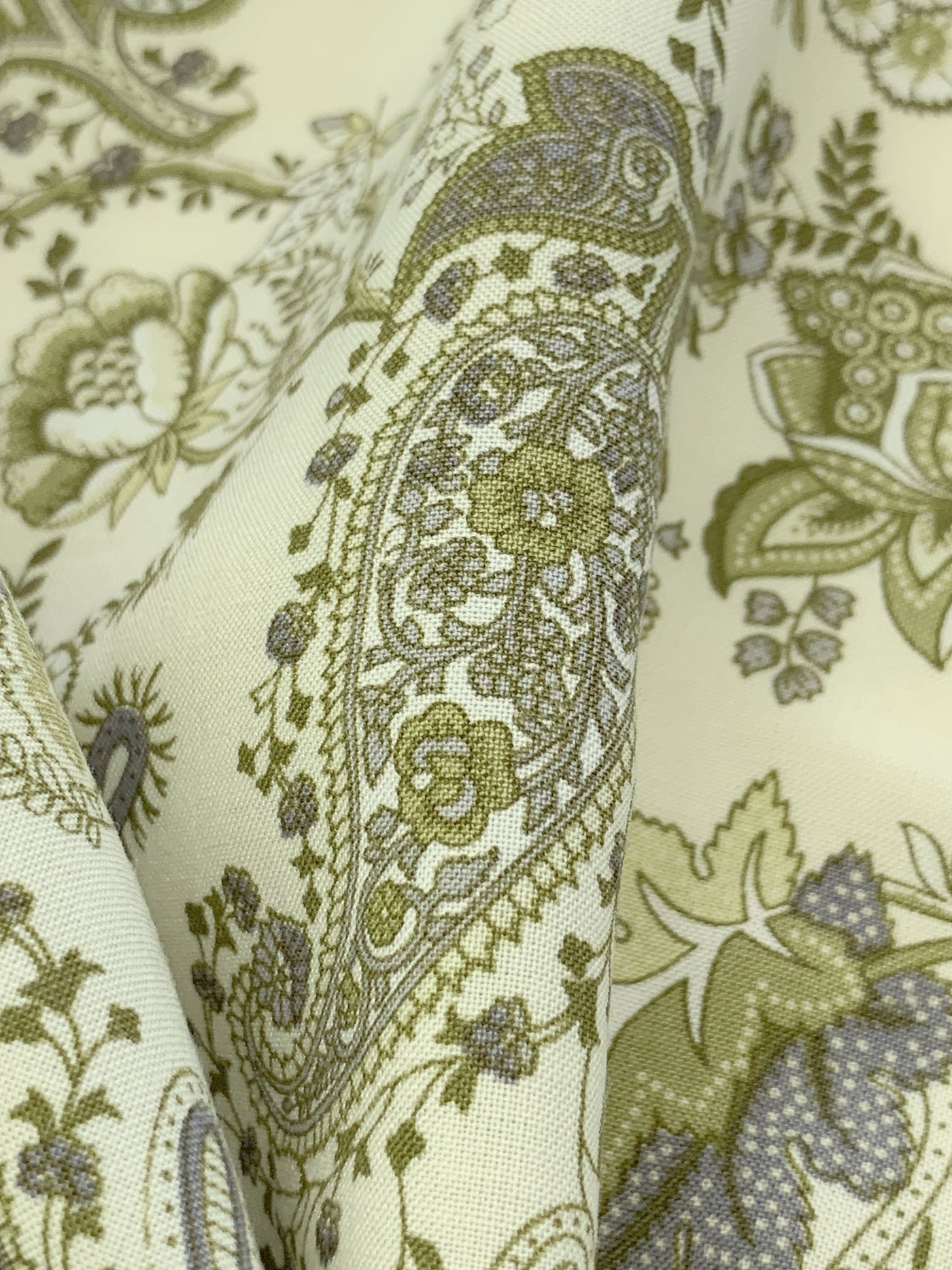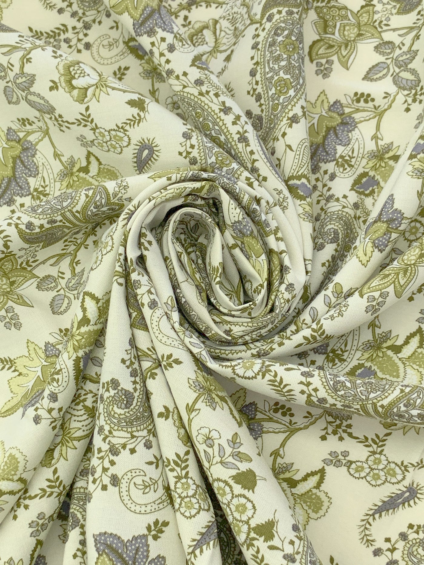 Antique Off-White/Old Moss Green/Dark Gray/Multi 100% Rayon Ornate Floral Print Challis 43W