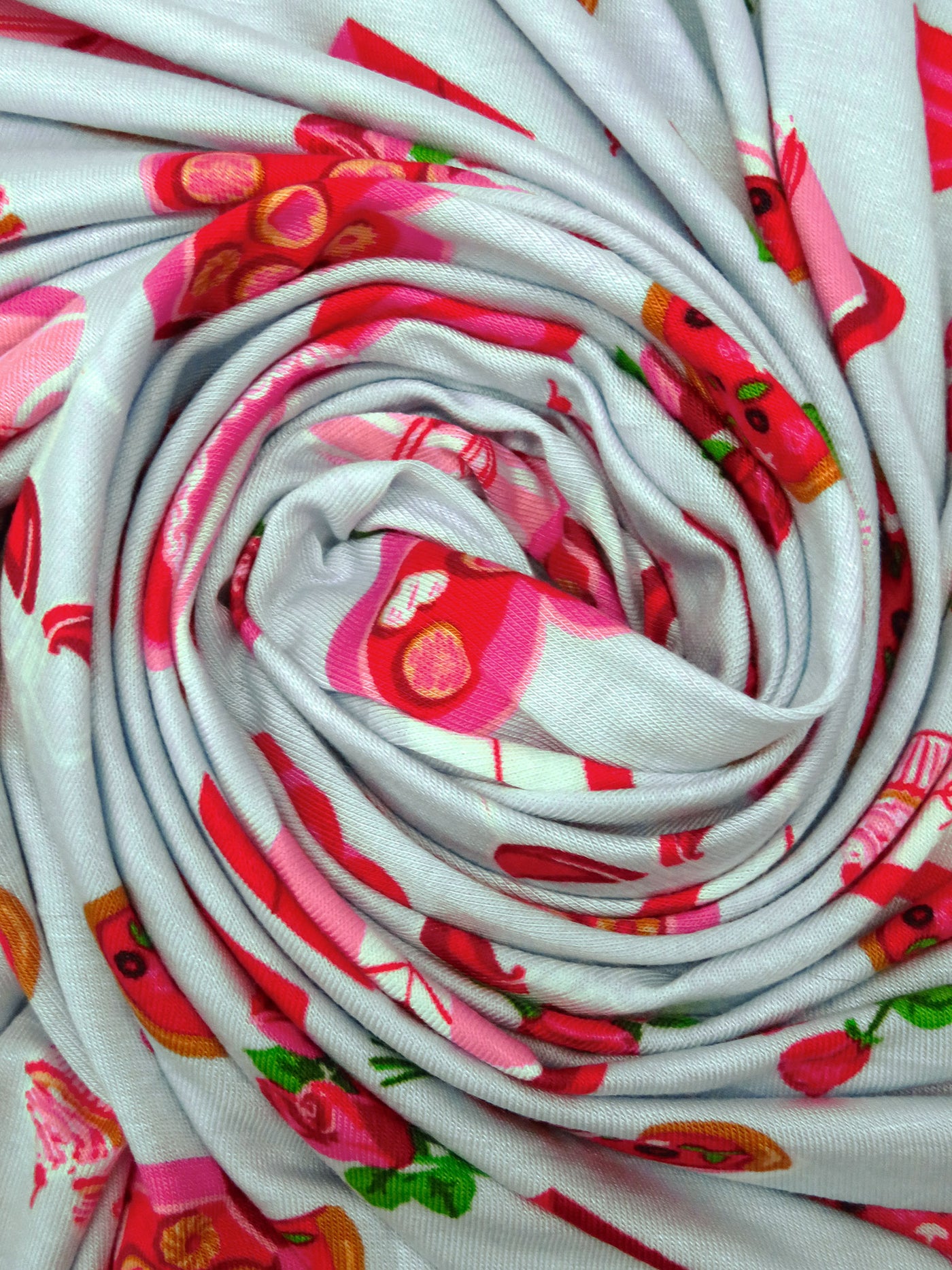 Light Pink/Light Blue/Scarlet Red/Multi Rayon/Lycra Sweet Treats Print Jersey Knit - NY Designer - 66W