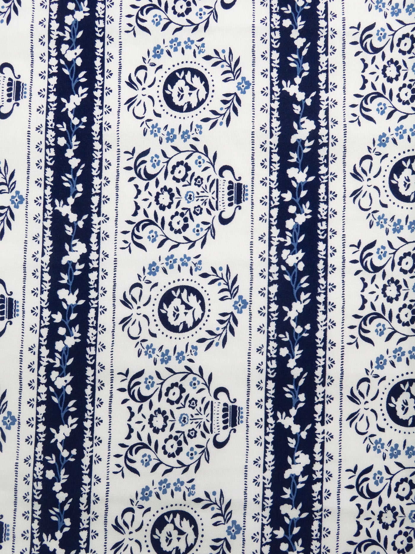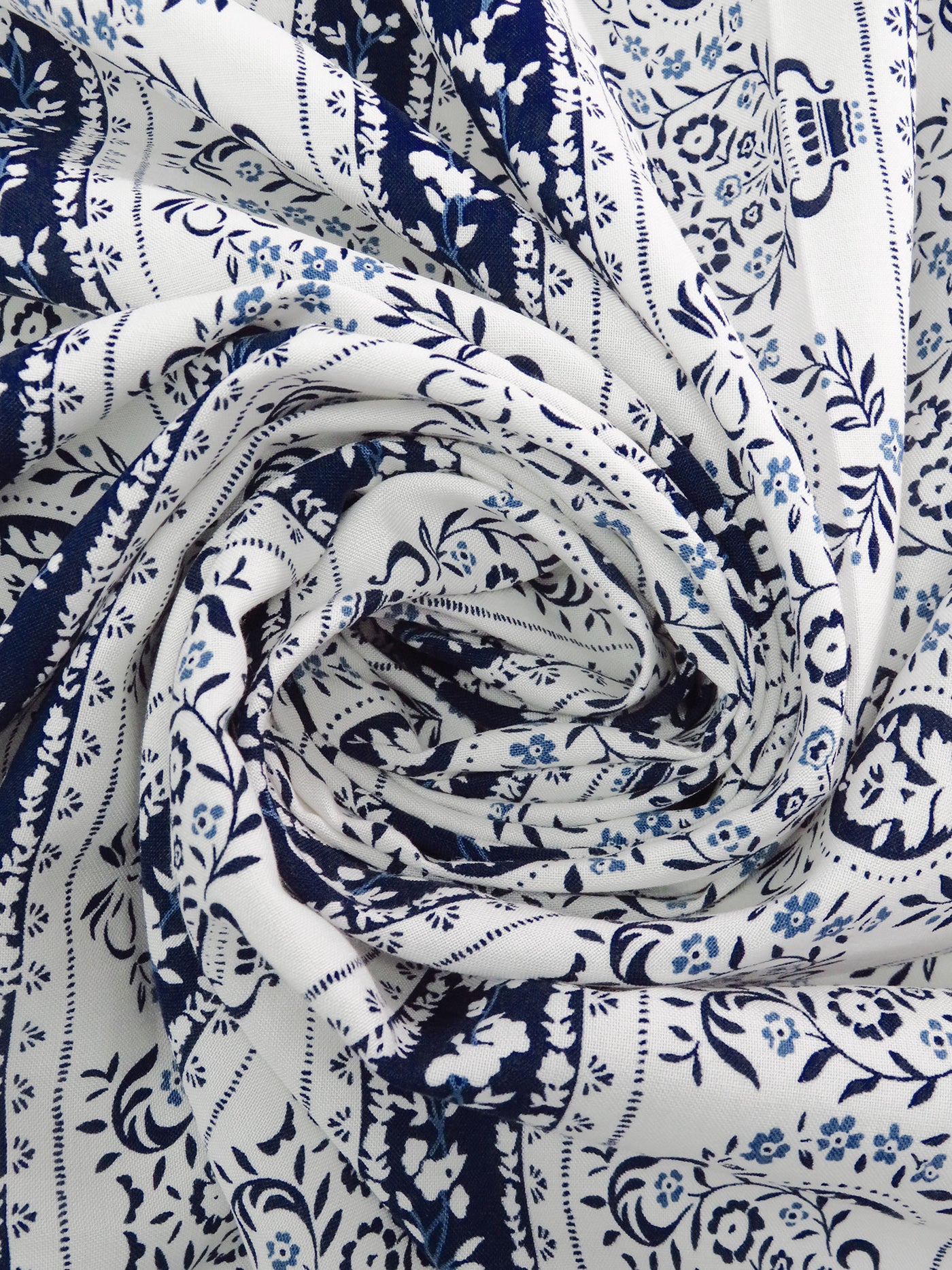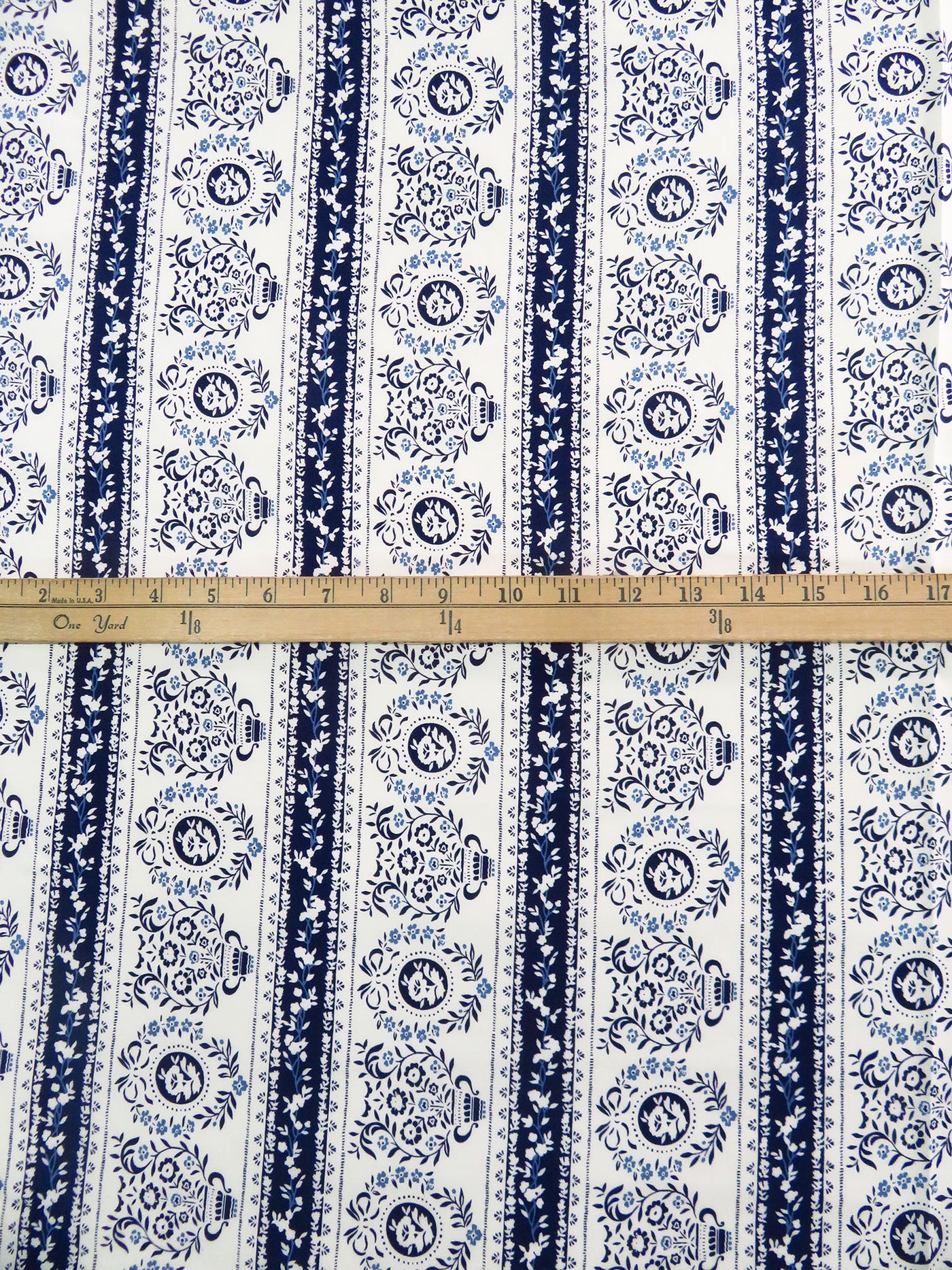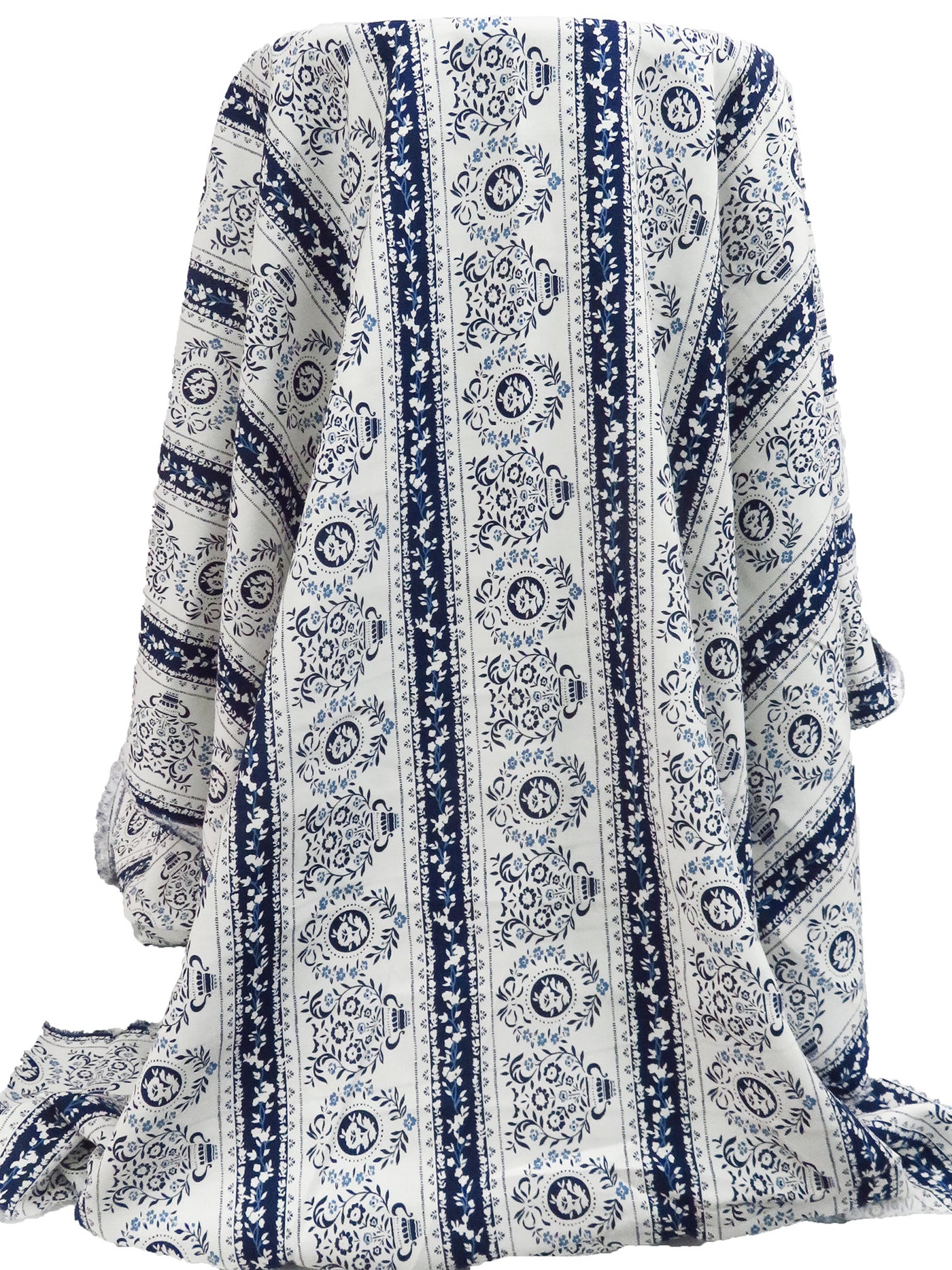 White/Midnight Navy/Dark Cornflower 100% Rayon Folk Motif Vertical Stripe Print Challis 44W