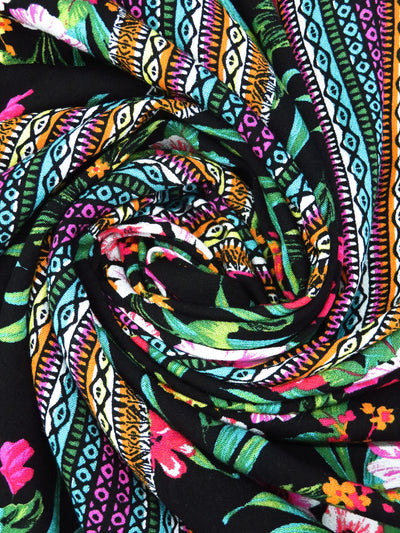 Black/Sea Green/Tangerine/Multi 100% Rayon Tropical Floral And Geometric Vertical Stripe Print Crinkle Challis 52W