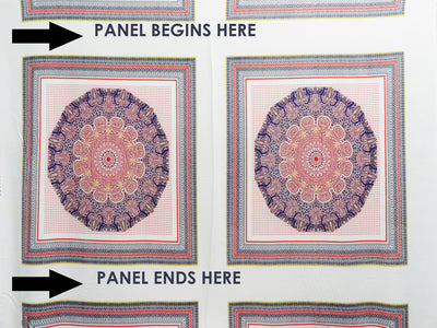 SOLD BY THE PANEL ONLY - Coral Red/Deep Indigo Blue/Goldenrod/Multi 100% Rayon Double Ornate Fractal Print Crepe Challis 54W