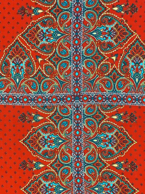 Scarlet Red/Pale Blue/Yellow/Multi 100% Polyester Large Ornate Paisley Print Crepe Blouse Weight Woven 54W
