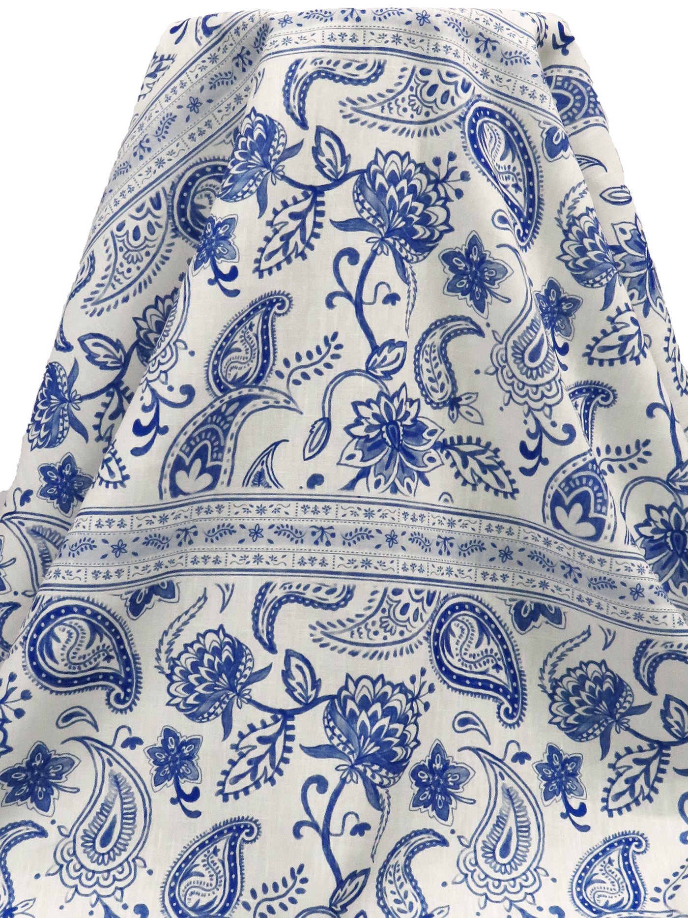 Dark Cornflower/Off-White 100% Polyester Ornate Paisley Horizontal Stripe Print Linen-Look Shirt-Weight Woven - NY Designer - 58W