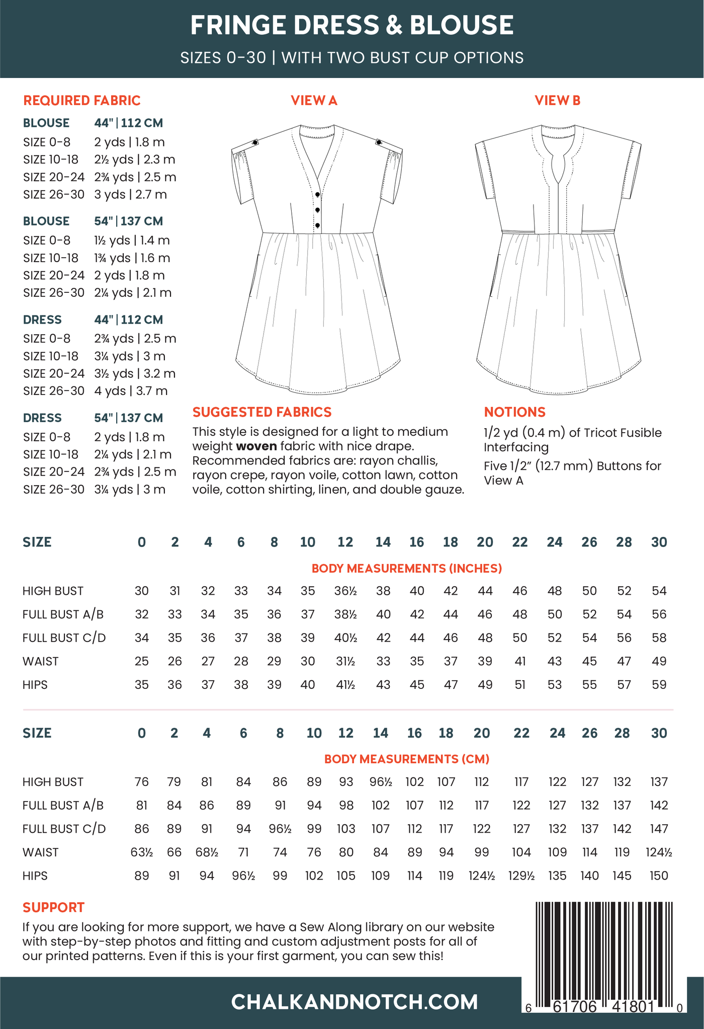 The Fringe pattern is a woven dress and blouse with two views. View A has a button up front, elbow sleeve and sleeve tab. View B has a pull over, notched front with a cuff. Both views include two cup sizes, optional waist ties, and the sleeve/cuffs are interchangeable.