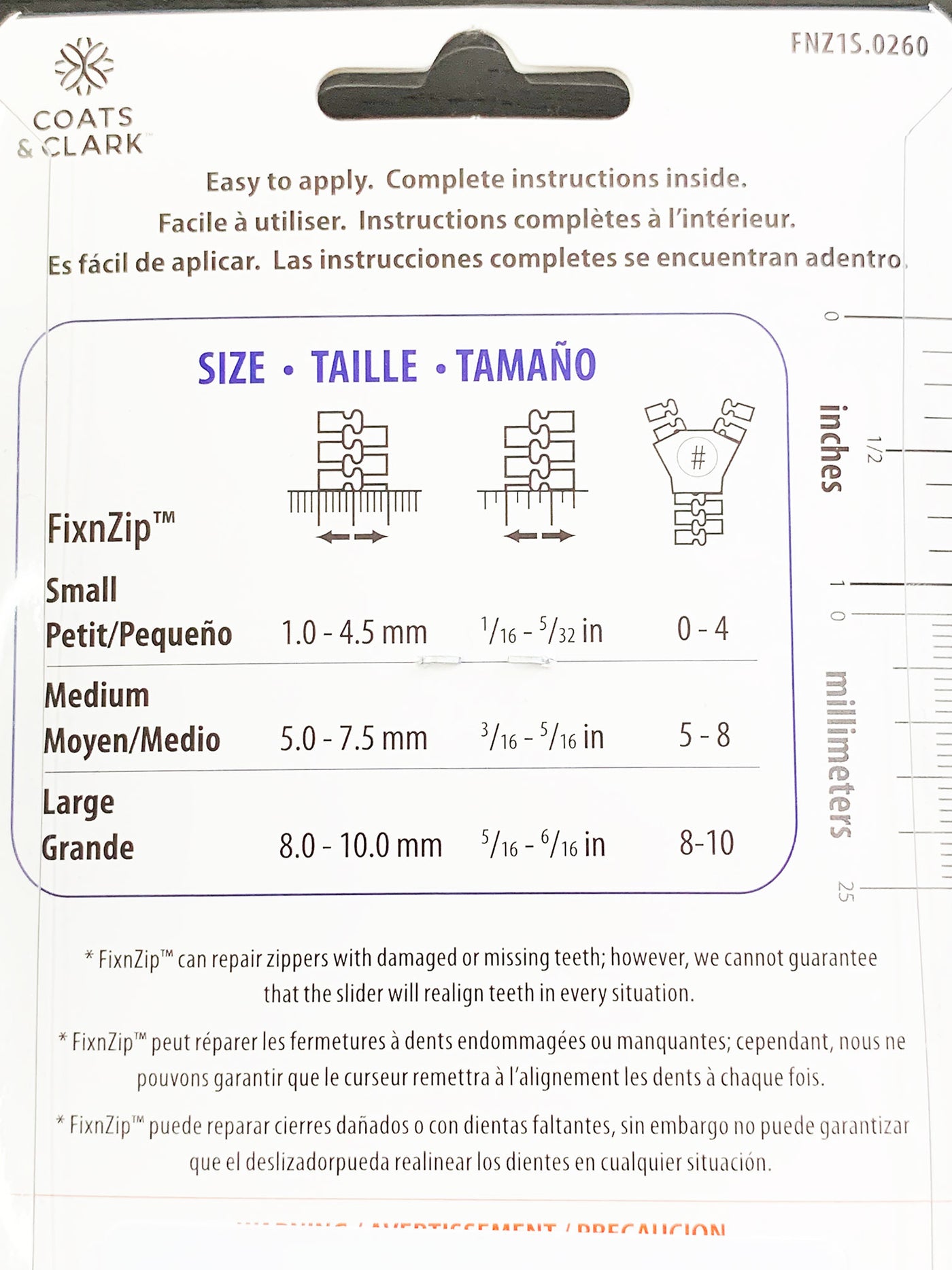 Works on a variety of small sized zippers. Great for missing or damaged zipper sliders. Will work on some zippers with damaged or missing teeth. Includes easy to understand instructions.